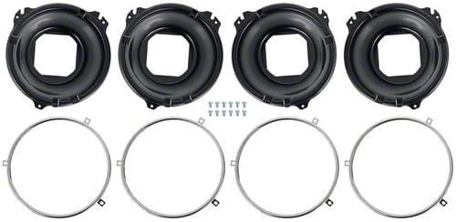 Reproduction of the original headlamp mounting set designed for use on various Chevrolet and GMC truck models. This set includes four 3-tab stainless headlamp retaining rings, four EDP coated "square-hole" style headlamp buckets, and the 12 screws needed to secure the trim rings to the bucket.