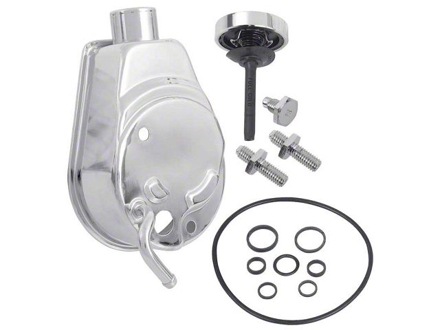 Reproduction of the original style power steering reservoir, vap and hardware for use with various 1970-75 Chevrolet models as listed. This reservoir comes with all o-rings and hardware necessary to install on your power steering pump. When appearance is a concern, this OE style reservoir will maintain originality but add a touch of chrome. Replace the old, dented, leaky, or missing reservoir with this custom reproduction.