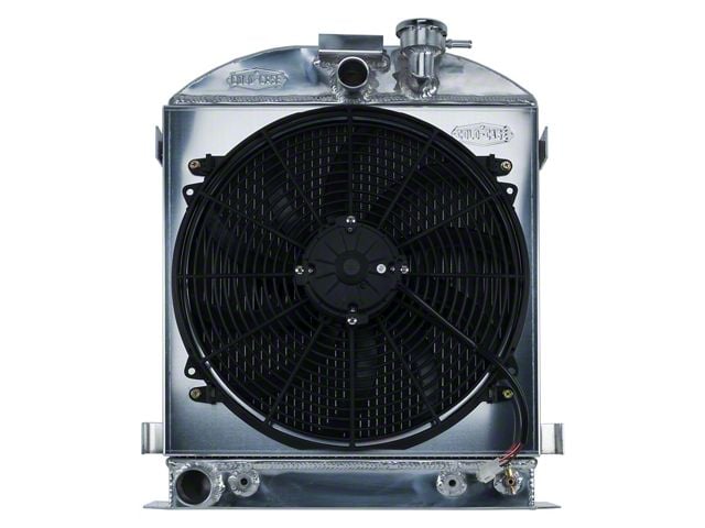 1932 Lowboy Ford Engine Aluminum Performance Radiator and 16 inch fan kit. These COLD-CASE radiators are Tig welded 100 percent aluminum and absolutely beautiful. Don't buy a 3 or 4 row aluminum radiator! It doesn't cool as good as these oversize 2 row models.