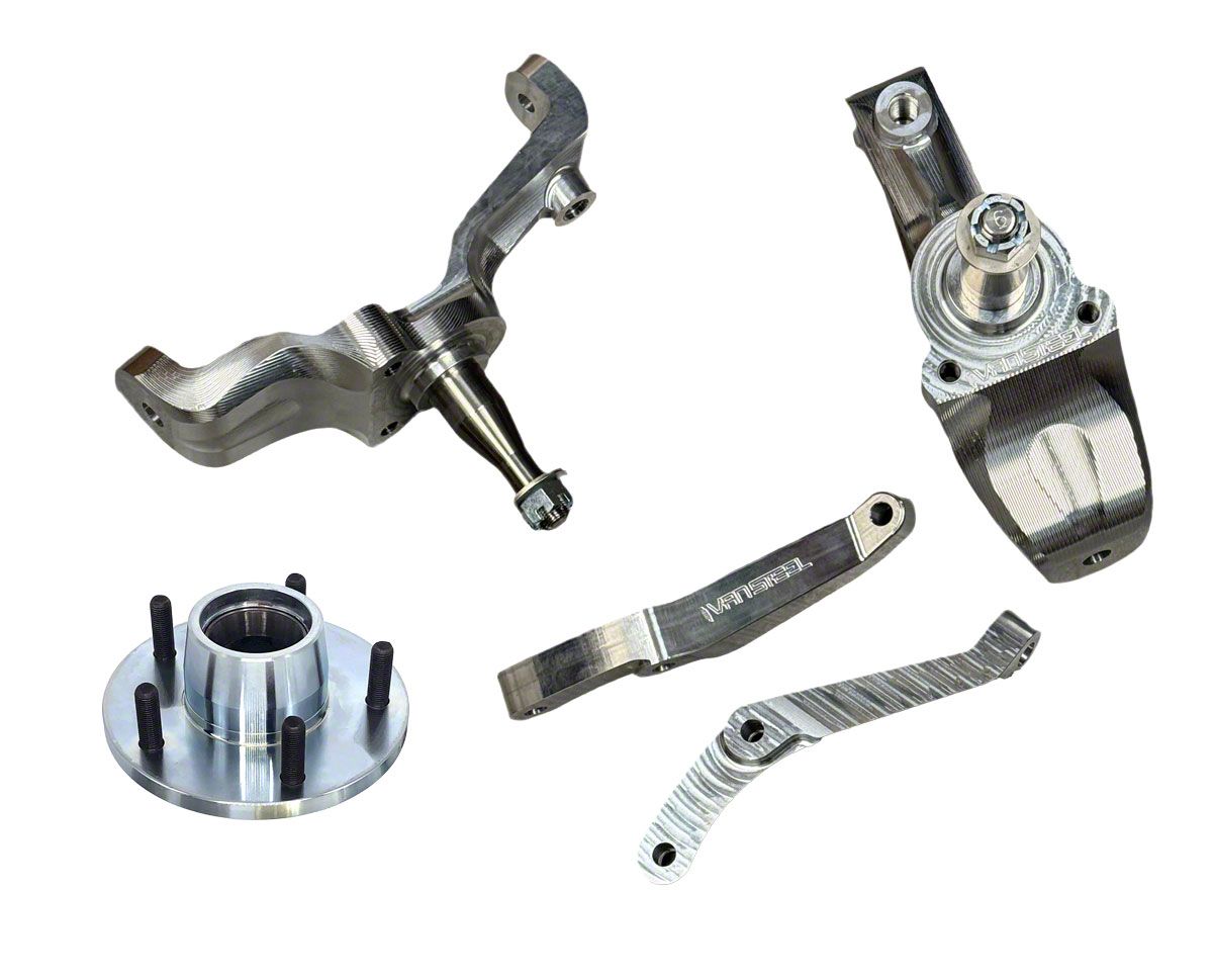 1" Drop Spindle x2LH & RH Steering ArmsMachined out of 6061-T6Raised Roll CenterRetains Factory D8 Calipers and RotorsPreserves and can Improve Ride Quality Improves HandlingRetains Suspension TravelReduced WeightBig Bearing Hubs (1969-82) Our billet aluminum drop spindles preserve ride quality b/c spring rate is not changed and shock absorbers retain shock travel (for non lowered cars). For lowered cars with reduced shock travel, drop spindles will help improve ride because it will give back 1" of shock travel that was lost making the shock less likely to bottom out. These will pair great with BB coil springs in SB cars for a total of 1.75-2" drop or coilovers. Drop spindles will also improve handing because of a lower center of gravity. The spindles and steering arms reduce unsprung weight netting a 9 lbs. weight loss, 4.5 lbs. per side. Unsprung weight improves traction and stability by allowing the wheels to follow the contours of the road more closely, increasing tire contact and improving grip. With less mass moving up and down the wheels can change direction faster thus, making the car more responsive. These drop spindles are taller than OE. By raising roll center it decreases body roll and increases stability. Does NOT change track width. Included in this kit are 2 new late hubs. New front hubs come complete with Timken Bearings. Each hub is inspected after the races are installed for proper run out spec. This ensures no pad knock and a better braking system. Our hubs are made in America out of 4140 Annealed and are stronger than factory cast hubs. Late hubs (1969-82) are required for now Factory Caliper Mounting brackets are re-used when assembling the kit but a small modification has to be made to the bracket. A 7/16" hole needs to be drilled out to 1/2" or buy new late brackets.