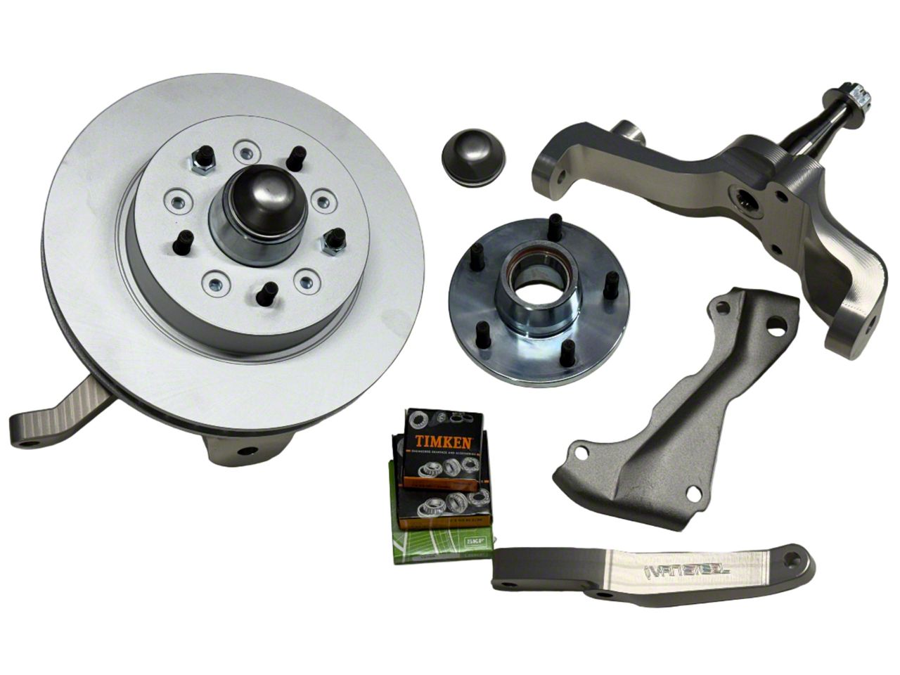 Complete units, ready to bolt on with standard rotors. Ships in two boxes.Fully AssembledBolt-On Kit1" Drop Spindle x2Machined out of 6061-T6Raised Roll CenterBig Bearing Corvette Hubs (1969-82)Retains Factory D8 Calipers and RotorsPreserves and can Improve Ride Quality Improves HandlingRetains Suspension TravelReduced Weight Our billet aluminum drop spindles preserve ride quality b/c spring rate is not changed and shock absorbers retain shock travel (for non lowered cars). For lowered cars with reduced shock travel, drop spindles will help improve ride because it will give back 1" of shock travel that was lost making the shock less likely to bottom out. These will pair great with BB coil springs in SB cars for a total of 1.75-2" drop or coilovers.Drop spindles will also improve handing because of a lower center of gravity.The spindles and steering arms reduce unsprung weight netting a 9 lbs. weight loss, 4.5 lbs. per side. Unsprung weight improves traction and stability by allowing the wheels to follow the contours of the road more closely, increasing tire contact and improving grip. With less mass moving up and down the wheels can change direction faster thus, making the car more responsive.These drop spindles are taller than OE. By raising roll center it decreases body roll and increases stability. Does NOT change track width. Included in this kit are 2 new late hubs. New front hubs come complete with Timken Bearings. Each hub is inspected after the races are installed for proper run out spec. This ensures no pad knock and a better braking system. Our hubs are made in America out of 4140 Annealed and are stronger than factory cast hubs. Late hubs (1969-82) are required for now because we are only manufacturing these for the larger bearings. You choice of standard or slotted and drilled rotors.Calipers NOT included.63-64 Conversions need to add front calipers. Kits do not come with calipers