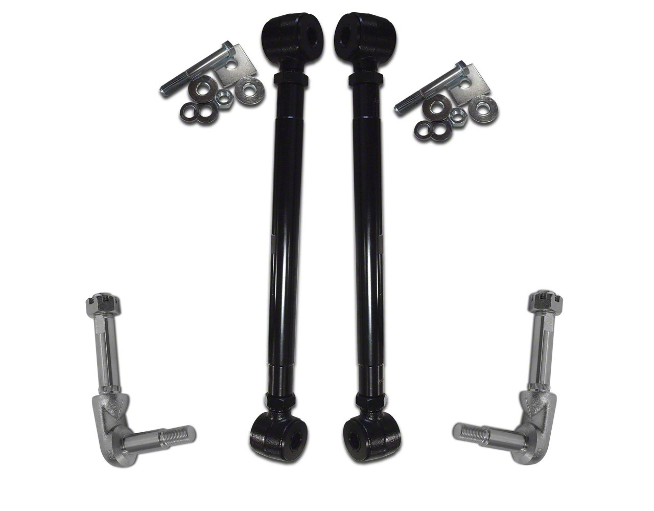 Construction and Appearance. Constructed with high-quality materials, this strut rod set includes durable polyurethane bushings and robust lower shock mounts for increased longevity. The glossy black and raw metal finish adds a sleek, professional look while providing enhanced resistance to wear and corrosion.