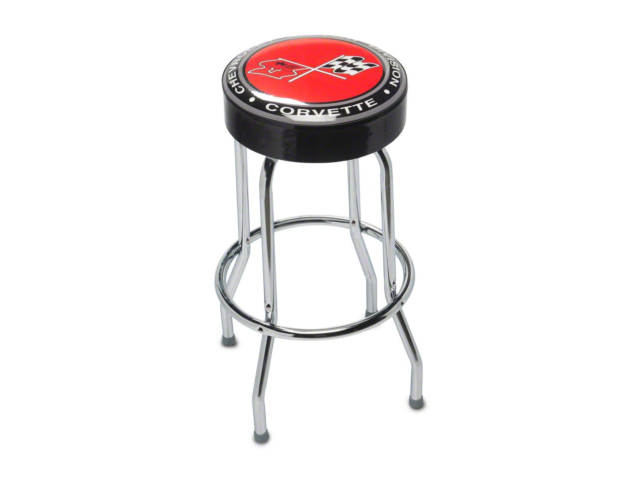 Classic Corvette Bar Stool. This bar stool is a perfect addition for Corvette enthusiasts looking to add a touch of automotive flair to their home or garage. With the iconic Chevrolet Corvette crossed-flags logo featured prominently on the seat, this stool combines style and comfort, making it a great seating option for any Corvette fan.