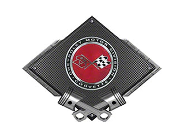 Corvette C3 Crossed Flags Sunburst Emblem Metal Sign, BlackCarbon Fiber, Crossed Pistons, 25 X 19