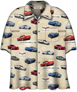 Stylish and Comfortable. The Corvette Camp Shirt by David Carey Design showcases C6 Corvettes and logos on a tan background. This shirt combines full-color artwork and officially licensed logos by GM, providing style and comfort year-round.