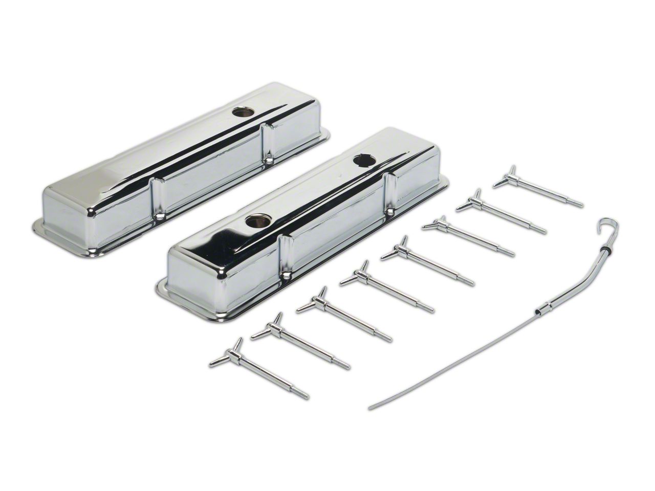 Construction and Appearance. Each component in this kit features a polished chrome finish that delivers a show-quality shine. It includes short baffled valve covers, a 23-inch dipstick and tube, twist-in oil cap, chrome grommets, hold-down tabs, and wing nuts—all crafted to give the engine bay a uniform and detailed appearance. The parts are designed to replicate OE fit and finish while upgrading aesthetics.