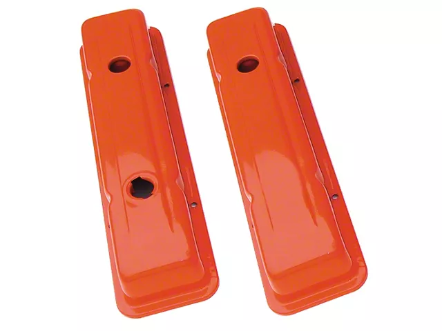 Construction and Appearance. Finished in a bold, glossy orange, these valve covers stand out while honoring the classic GM engine look. Built with OE compatible design and short height profile, they replicate original factory styling while offering enhanced durability. Their robust construction ensures a secure seal and resistance to high engine temperatures and vibration.