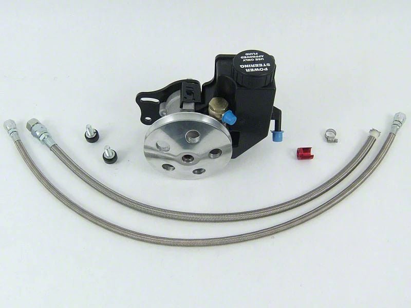 Effortless Power Steering Upgrade. The Power Steering Pump with Clip-On Reservoir offers a reliable and efficient solution for improving your vehicle's steering performance. Designed for seamless installation, this pump features a polished aluminum V-belt pulley and includes hoses for rack and pinion connection, ensuring smooth and precise operation.