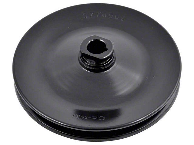 This is a quality OER® reproduction of the original power steering pump pulley designed for use on various GM applications. This pulley is manufactured to exact factory specifications and stamped with the original GM part number for authenticity. (3770808). Single groove and 5-3/4" 0.d. This pulley is made from formed and machined steel with the correct key way fit design, is finished in satin black and features correct markings as original.