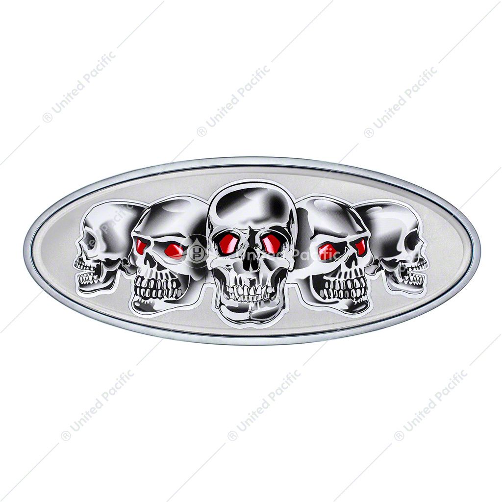 Beautiful high quality chrome plated finish with triple chrome plating process. | Sold each | Die cast oval emblem with silver outer accent and red eye socket | 7-7/8 X 3-1/4", aluminum decal | Mounting studs are 6-1/4" apart and speed nuts are included.