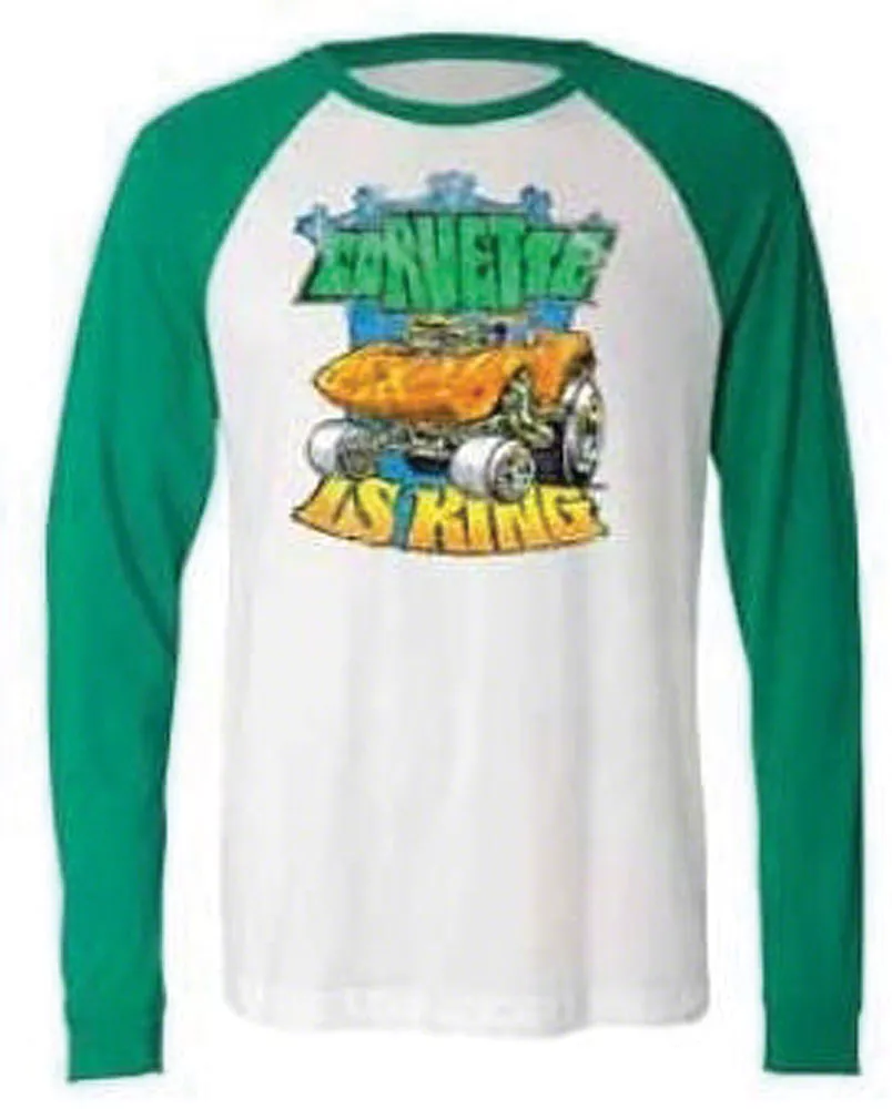 Corvette-Inspired Vintage Style. The Corvette T-Shirt is a long-sleeve, baseball vintage style garment celebrating the timeless muscle car era. Featuring a bold "Corvette Is King" full-front print, this shirt pays homage to classic car enthusiasts. It's an officially GM licensed product designed for comfort and durability.