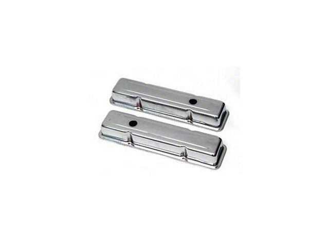 Classic Engine Bay Upgrade. These Valve Covers feature a chrome-plated finish that adds a high-gloss, classic look to your Small Block Chevrolet engine. Designed with a short style, they provide the necessary clearance in tight engine bays, making them an ideal choice for enhancing both the appearance and performance of your vehicle.