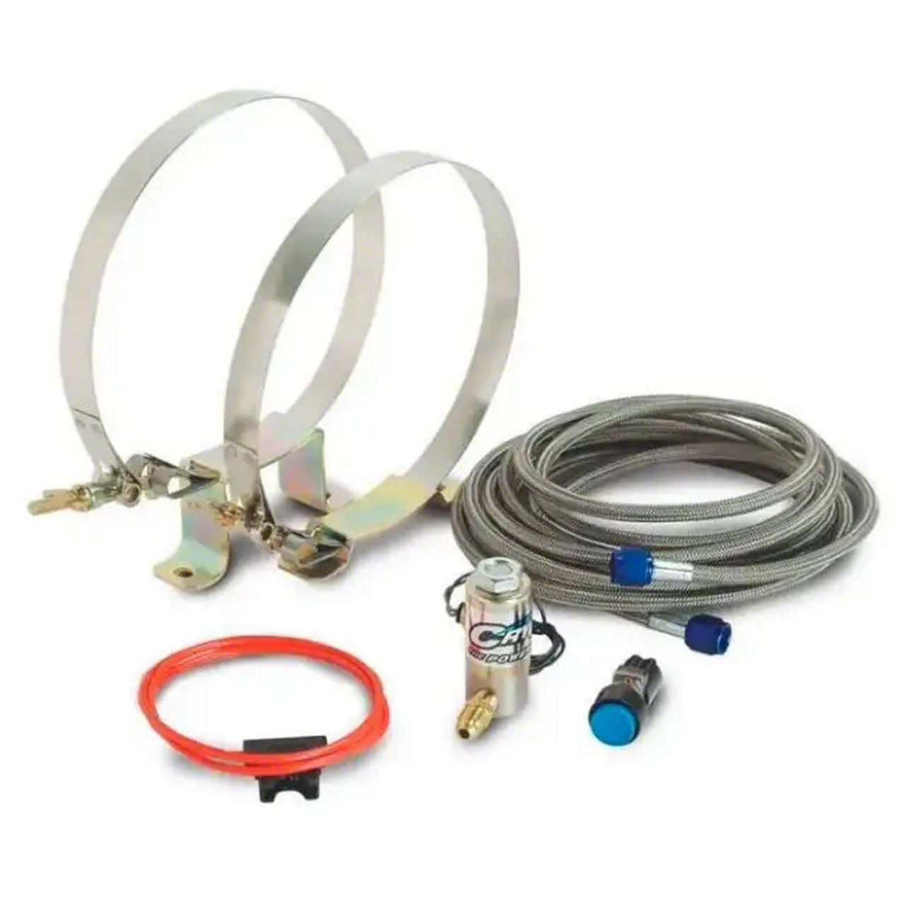 The foundation to every CryO2 system: this kit must be present to utilize CO2 components. This kit includes a cryogenic solenoid valve, all necessary fittings, tank mounting brackets, 14 ft. stainless steel hose, wide open throttle switch, arming switch, and wiring kit. Only one kit is needed to operate all the CO2 components. NOTE: This kit does not include a CO2 tank