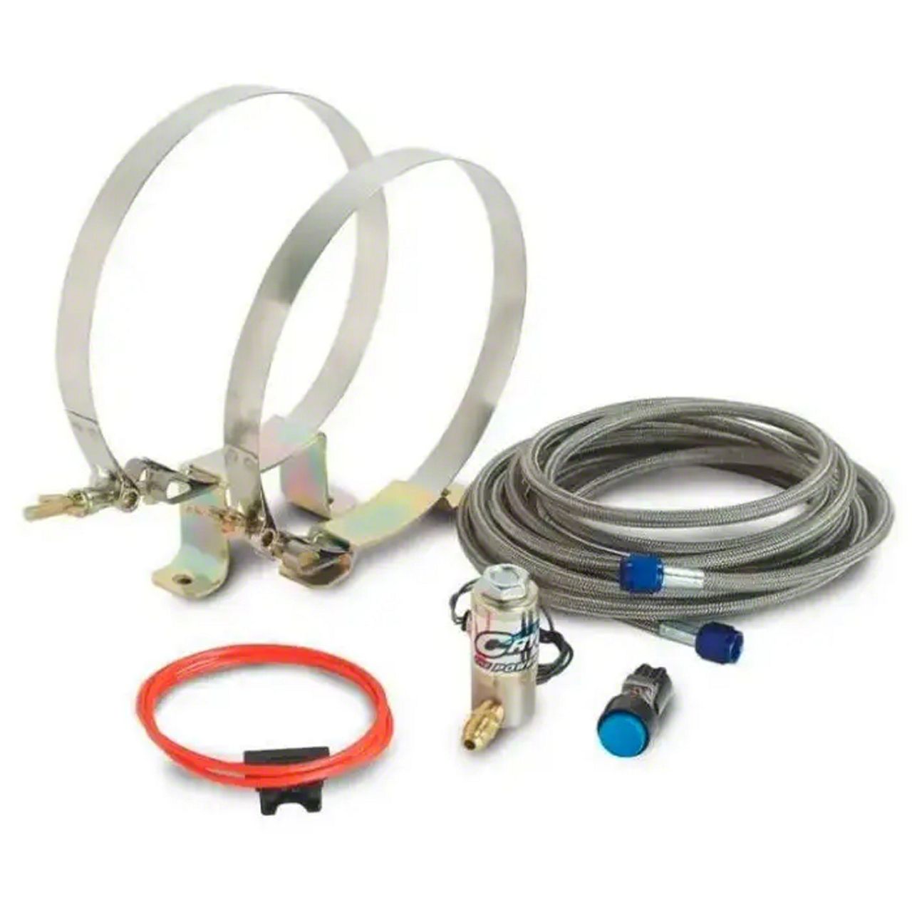 The foundation to every CryO2 system: this kit must be present to utilize CO2 components. This kit includes a cryogenic solenoid valve, all necessary fittings, tank mounting brackets, 14 ft. stainless steel hose, wide open throttle switch, arming switch, and wiring kit. Only one kit is needed to operate all the CO2 components. NOTE: This kit does not include a CO2 tank