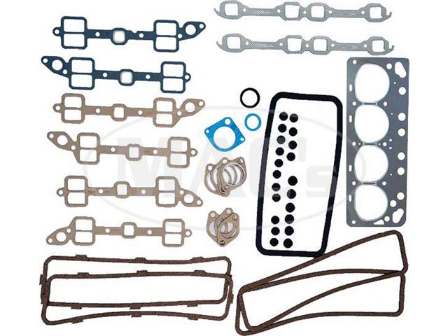 Contains all necessary gaskets and seals required to remove and replace the cylinder head(s) and to grind the valves. Does not contain carburetor, carburetor PCV adapter block or large tin Bathtub intake manifold gaskets.