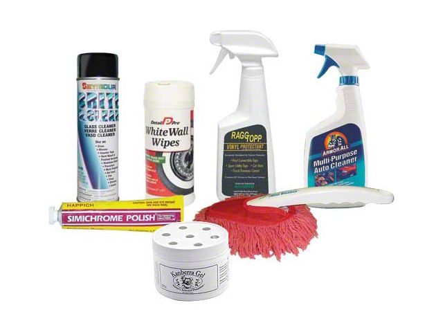 This kit also includes a mini-duster, polish for chrome, ArmorAll cleaner to cut through the grime, glass cleaner, vinyl protectant and white wall wipes.