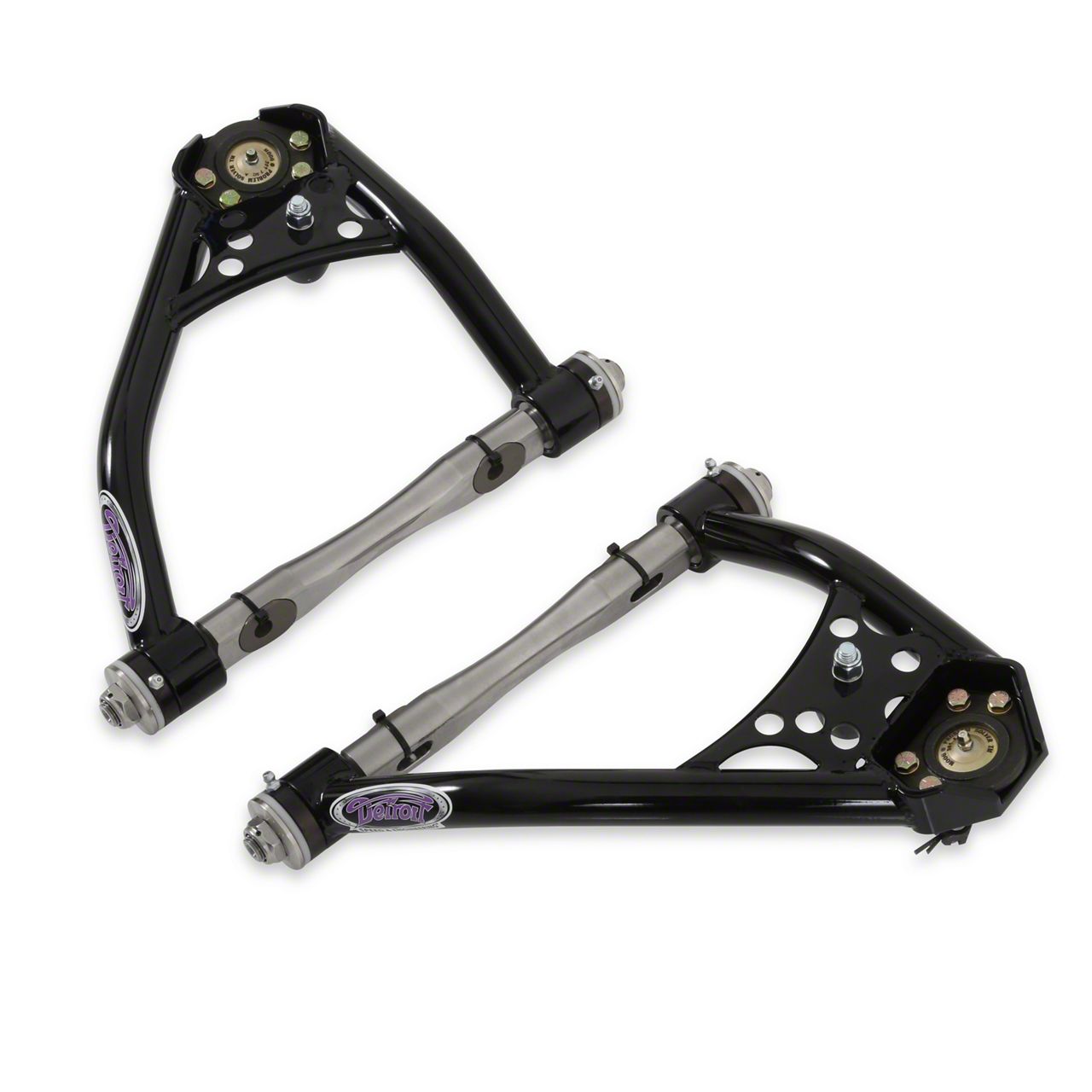 • Lower control arms feature additional positive caster with Delrin bushings and a gloss black powder coat finish