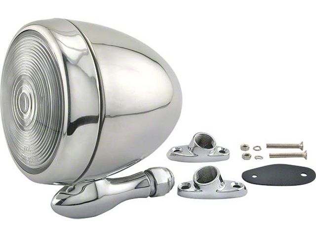 Reproduction of original dummy spotlight accessory. Chrome plated steel housing with chrome plated zinc die-cast arm and bracket. Mounts included for right and left side of car.