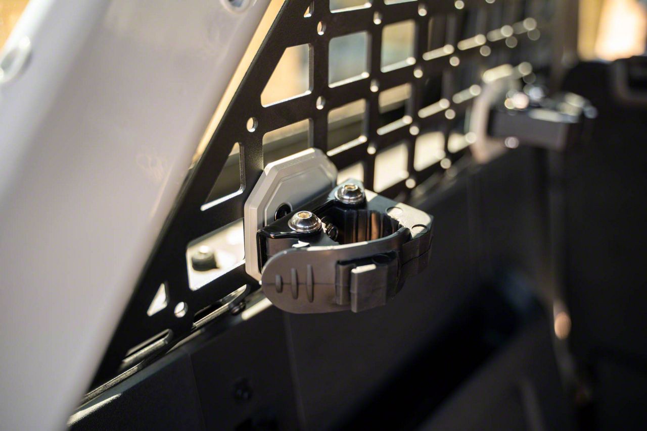 Our Quick Release Tool Mounts offer unlimited solutions for storing tools and equipment on your interior or exterior molle panels. They can be used individually for securing flashlights, recovery gear, tool bags, air inflator/deflator equipment, and other gear; or you can pair them up for mounting long handled tools such as shovels or axes. The mounts feature a quick release for easy access to your equipment. The clamp radius is adjustable from 1 ¼ inches to 1 ⅝ inches for storing various sized accessories, and it rotates at the base for versatile mounting angles.Our molle accessory mounts are made from a combination of durable aluminum and high density rubber to withstand years of use. Choose between a red, gray, or black gloss powder coating to accent your vehicle’s styling. The mounts are designed for molle panels with 1 ½ inch X 1 inch rectangles, and they quickly bolt-on to the panels with the included sturdy stainless steel M6 hardware. Confidently deviate from the beaten path knowing your gear is secure with our molle mounts. * Please Note: Fitment is confirmed on DV8 Offroad, Rago Fabrication, and ADD Offroad molle panels.** Please Note: The mounts are only compatible with molle panels that are at least 2mm thick, and feature 1 ½” x 1” molle cutouts.