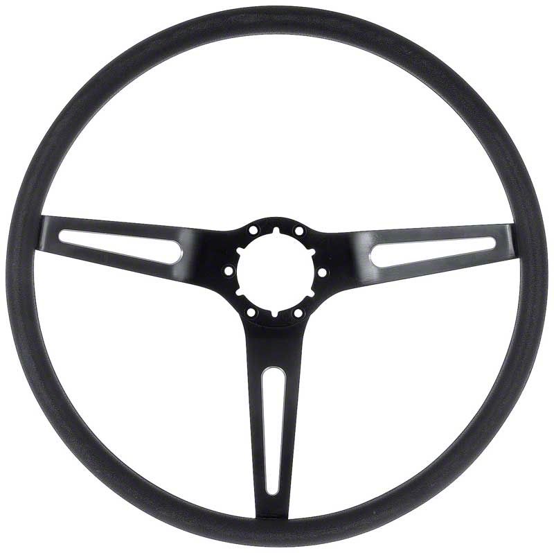 Replacement style custom 3-spoke Comfort Grip cushioned steering wheel designed for use with various 1969-1972 Chevrolet models with GM option NK1. Designed to replicate the original wheel with custom black powder coated spokes, beveled inner spokes, and a textured hard vinyl black grip.