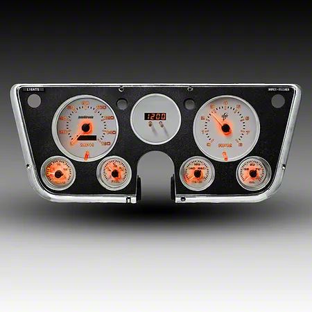 Speedometer, Tachometer, Fuel Level Gauge, Voltmeter, Oil Pressure Gauge, Water Temperature Gauge and Clock. Speed, oil & temp sending units included with kit.