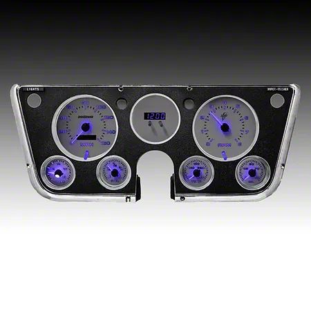 Speedometer, Tachometer, Fuel Level Gauge, Voltmeter, Oil Pressure Gauge, Water Temperature Gauge and Clock. Speed, oil & temp sending units included with kit.