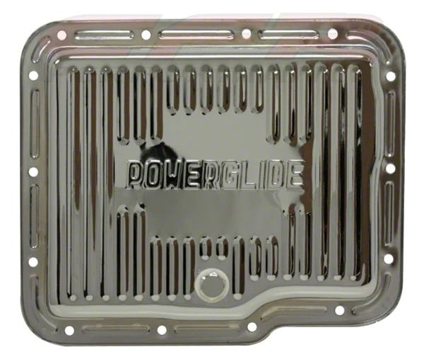 Chevy/GM finned chrome steel transmission pan fits Powerglide transmissions. Features a stamped Powerglide logo and comes with drain plug. Stock capacity. Depth: 2".