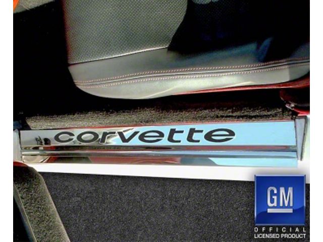 Construction and Appearance. Made from durable T-304 stainless steel, these sill plates feature a solid black finish with a laser-etched Corvette script and inlaid black background. This design offers a sophisticated and custom look, enhancing the interior aesthetics of your Corvette.