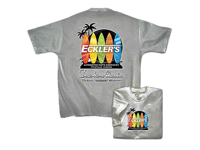 This 99% pre-shrunk cotton Limited Edition Eckler's T-Shirt features company logo and surfboards on the front and all of our Ford brand logo's on the back (Fairlane, Torino, Falcon, & Galaxie). This quality T-shirt is a must for the car enthusist! Available in white or ash (gray). Count on MAC's for all of your classic Ford needs.