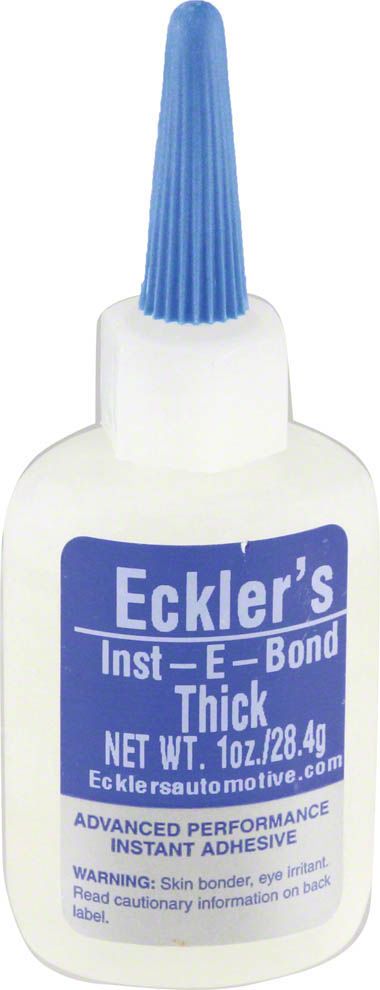 This is an ECKLER'S EXCLUSIVE. Eckler's has been in the Fiberglass business since 1965. After extensive research of working with many adhesives, Eckler's came up with the INST-E-Bond Automotive adhesive. INST-E-Bond is not just the "average" adhesive you would buy from your local store, it is superior to any adhesives out there in our opinion, or we would not put our name on it! It is a thick viscosity (chilled syrup) that is easy to work with and has a strong structural bond. Works great on rubber, plastic, wood, cloth, vinyl, and metals. Why replace those expensive parts or trim pieces when you can fix it with Eckler's INST-E-Bond Adhesive.