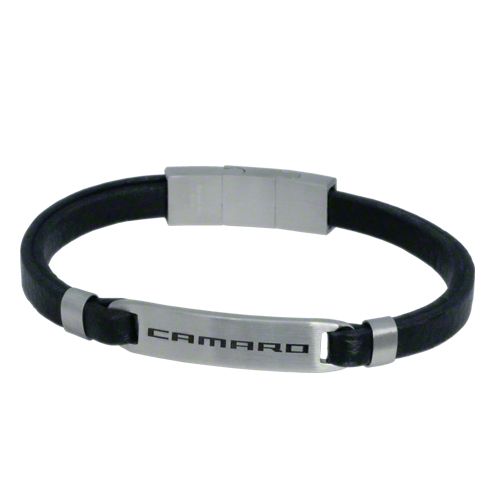 This black leather bracelet sports the Camaro signature. The comfortable bracelet measures 1/4″ wide and has a slide-on magnetic catch. This bracelet fits wrists 8.5″ or 8″ by removing one of the magnetic extension links.