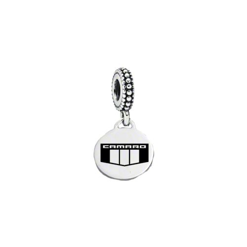 This Camaro emblem dangle charm comes with tire-looking base and black marked emblem. The charm base is large enough to go over the screw-type bracelets and fits Pandora, Chamilia, Biagi, Pugster, Troll and other bracelets. Sterling silver base /Stainless steel disc.