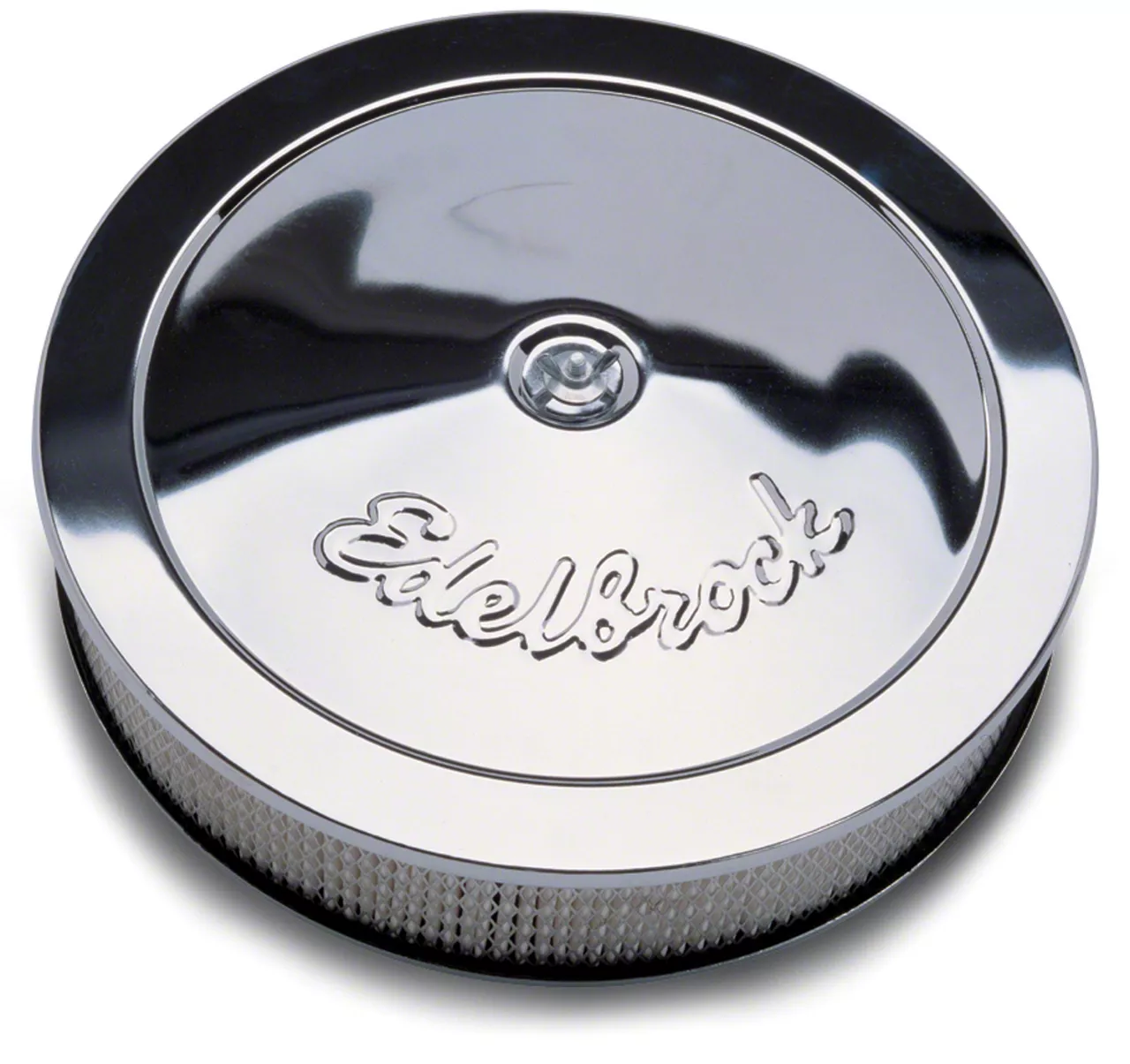 Edelbrock triple chrome-plated round air cleaners work with all popular 5-1/8" diameter carburetors (Performer Series, Thunder Series AVS, Holley, Thermo-Quad, Quadrajet and Carter AFB). The 10" and 14" models have knock-outs in the air cleaner base for use with Edelbrock crank case ventilation adapter #1205 (sold separately). #1208, #1209 and #1221 fit all Edelbrock carburetors. Heights of air cleaners are in parentheses, measured from the gasket flange to the top of the supplied retaining nut. Dimensions are accurate within 1/8".