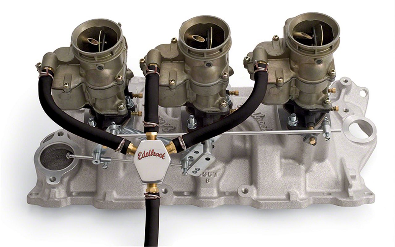 The Edelbrock Mini Triple feed allows the user to plumb a dual or triple carb setup from the fuel pump to the carb. Duel carb applications will require pipe plug number 662043 or similar 1/4"-18 NPT plug to block off the third outlet. This kit comes complete with four 1/4" NPT brass fittings, polished aluminum mini fuel block number 1286, eight corbin self- tightening clamps and 5 ft. Of classic black neoprene hose. neoprene hose features internal braid for added strength with a 3/8"" Inside diameter.