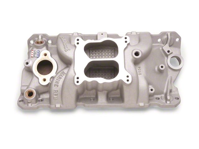 PERFORMER RPM Q-JET (1500-6500 RPM) Designed for 1955-86 262-400 c.i.d. Chevy V8's for spread-bore (Q-Jet) or square-bore carbs. Delivers maximum power and a broad torque curve for high-performance street. Carb pad will accept square-bore carbs without adapters. #2504 Marine intake features brass lined front water crossover and brass flange inserts to cover the rear water openings. Performer RPM Q-Jet has same provisions as #7101. Will not fit under stock Corvette hood.