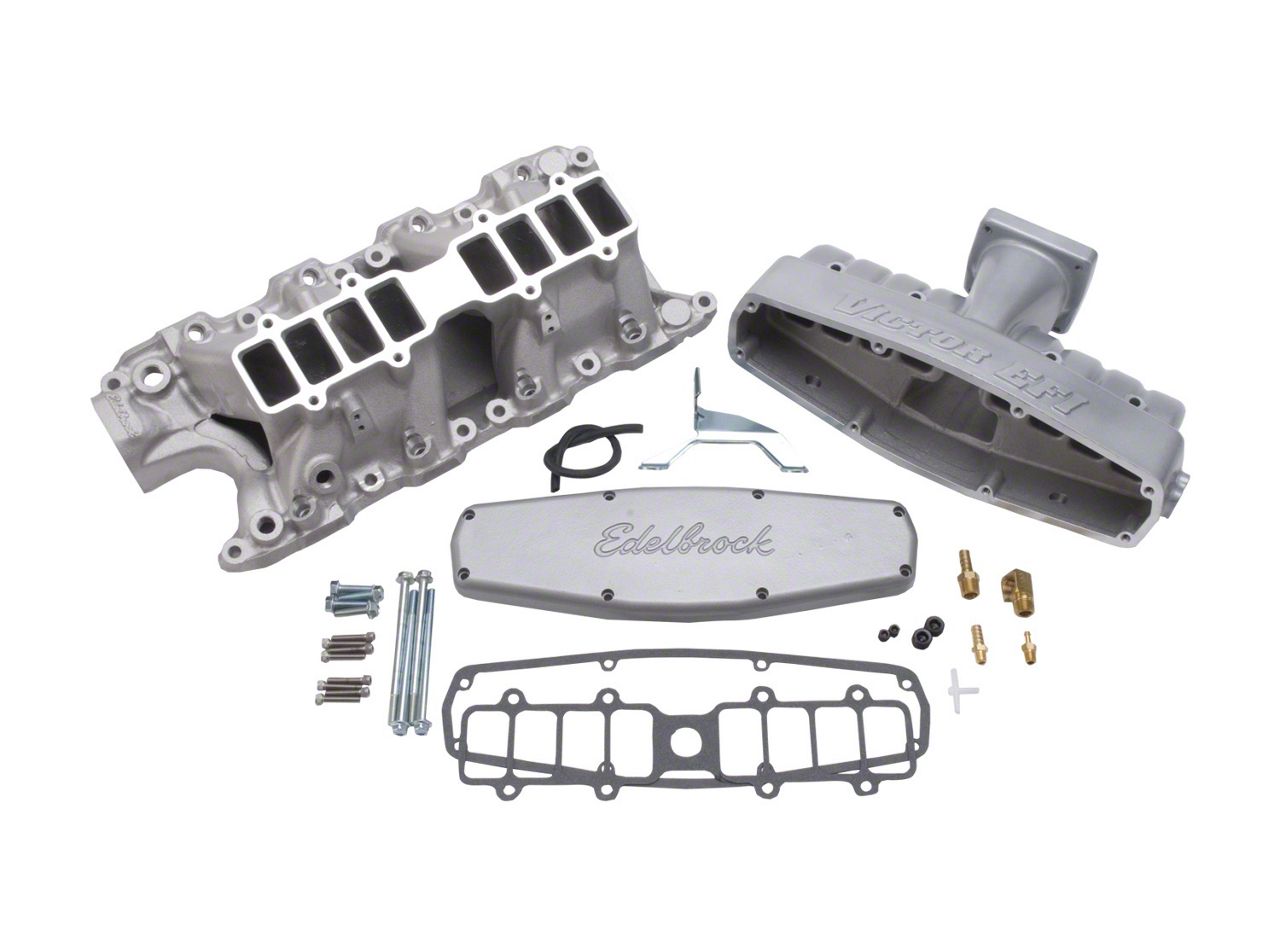 Designed for 5.0L-based competition EFI engines, the Victor 5.0 EFI aluminum intake manifold is for non-emission, racing applications. Intended for engines modified to produce 400 to 540+ horsepower, this intake manifold features shorter and larger runners for power to 7500 rpm. Runners are 11.5" long and 50% larger in area than Performer 5.0 #3821 runners. The base features an air-gap design and will accept stock or stock replacement fuel rails. The upper manifold will clear tall valve covers and large fuel pressure regulators. The upper and plenum cover are powder-coated light titanium gray. The base is satin aluminum and not powder-coated. Designed to work with Edelbrock Victor Jr. or Victor cylinder heads. Edelbrock 75mm throttle body is recommended for most applications with no EGR sp