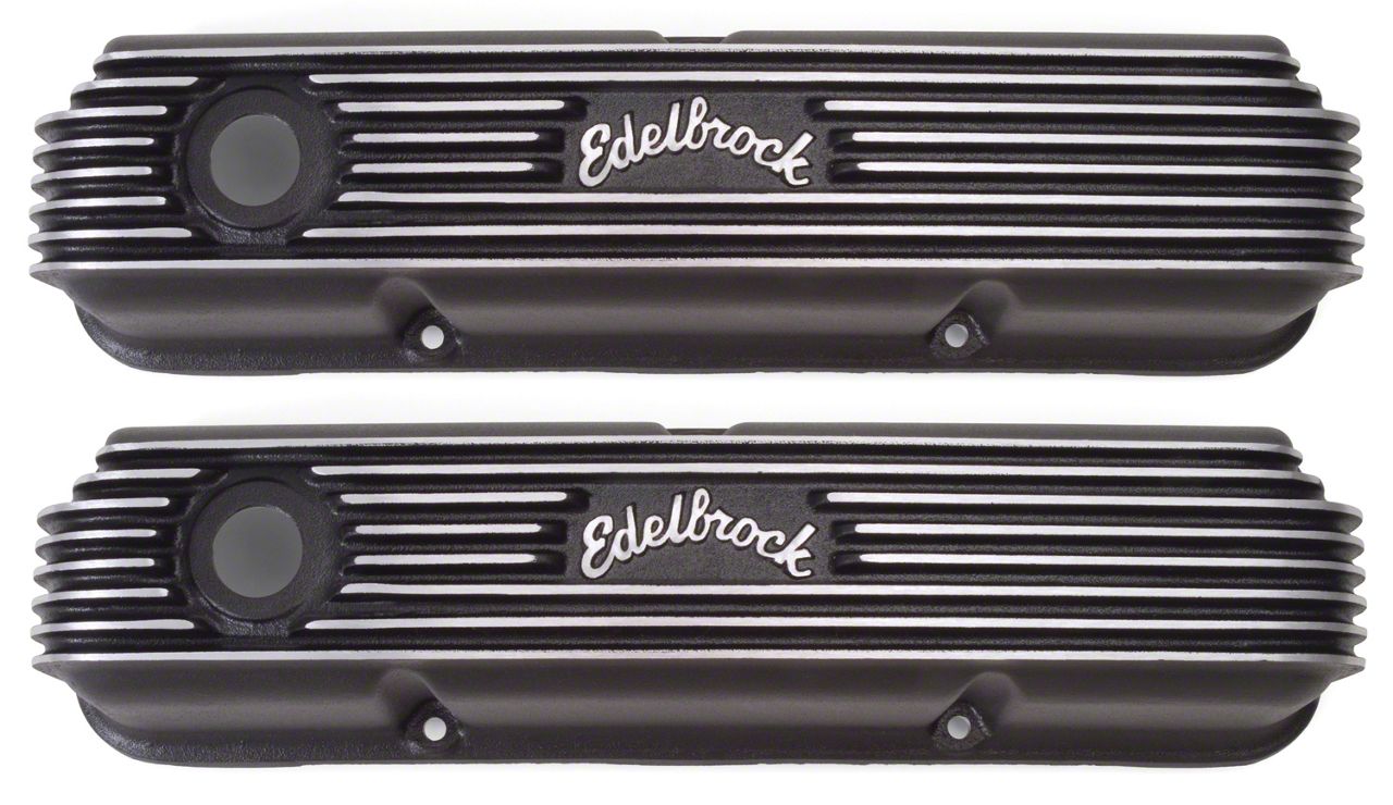 Edelbrock first made these aluminum valve covers in the late '50s and they're still a classic. Made of heavy-gauge sand-cast aluminum, our classic finned valve covers are available in either a classic polished aluminum or durable black powder coated finish. Overall height is measured from base to top at the highest point. Edelbrock classic valve covers can be machined to accept breathers if desired.
