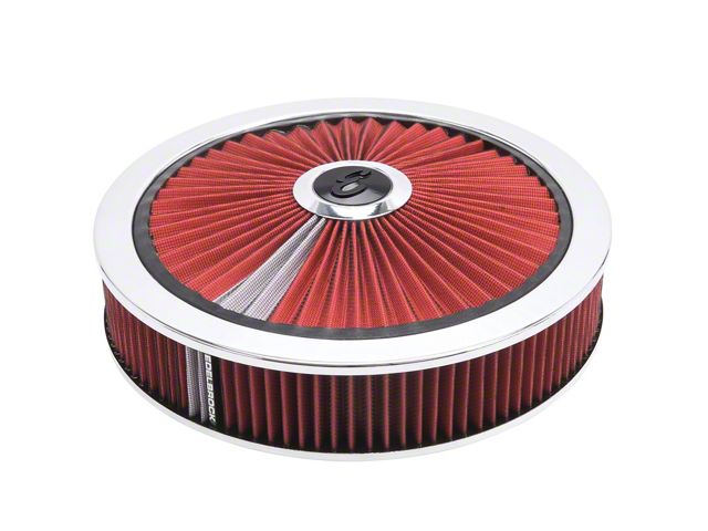 High Airflow and Filtration. Bring new, clean air into your system with this Edelbrock Pro-Flo 14-Inch Round Air Cleaner; Chrome; Red Filter. Designed to deliver great form with greater functionality, it sports a bold, modern design with its heavy-gauge, die-cast steel with a unique Pro-Charge strip which will indicate when it's time to clean your filter.