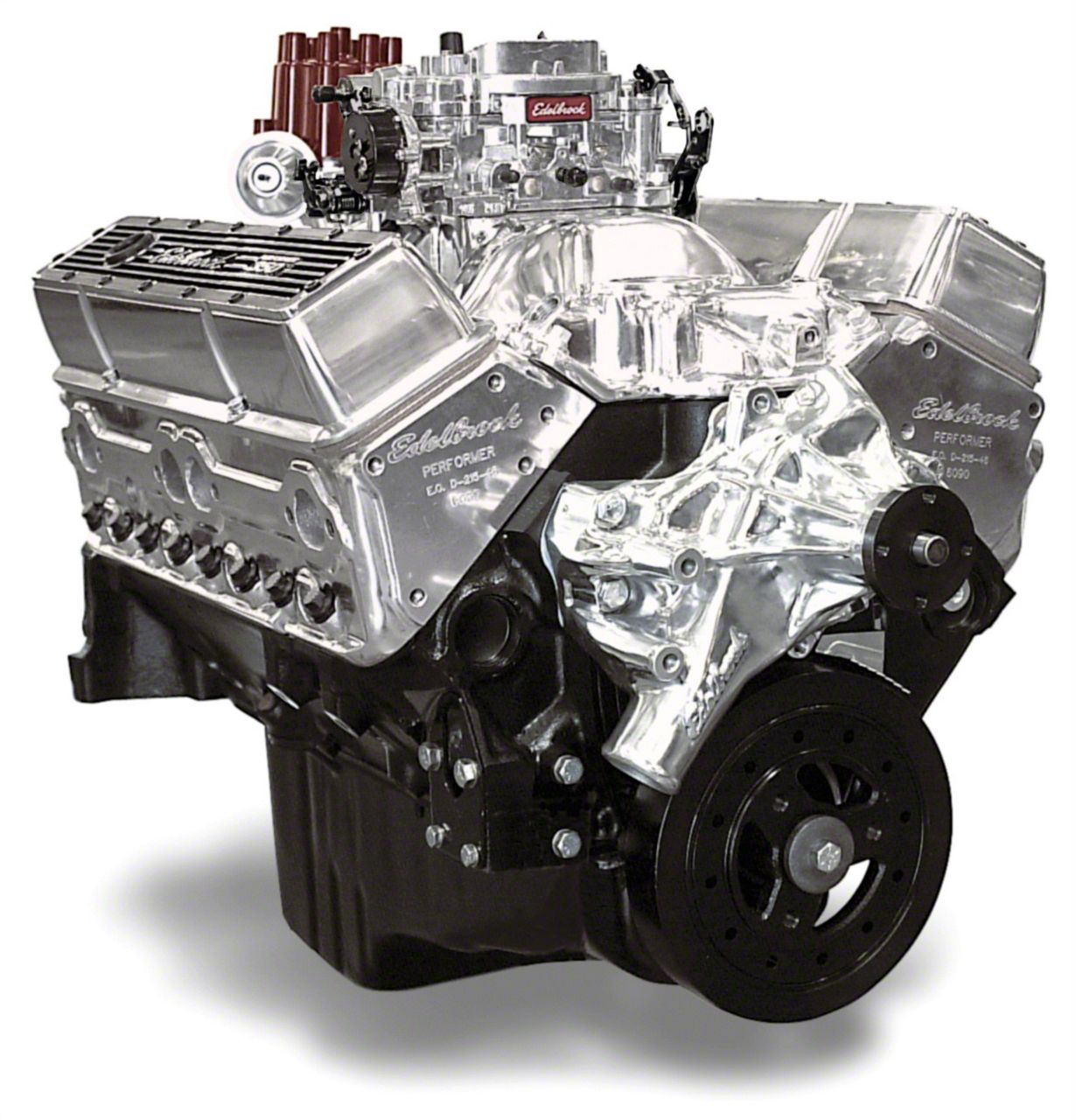 These entry level small-block Chevy crate engines are ideal for any street rod, muscle car or truck owner looking for 300+ hp performance on 87-octane fuel. Performer engines are 100% brand new and include a 4-bolt main short block, Edelbrock Performer heads, Performer hydraulic camshaft, roller rocker arms, Performer Series intake manifold and optional water pump. The Performer classic 310 is available with a single quad Performer Series carburetor or as a 3x2 with Edelbrock 94 carburetors. The single quad version features black finish accessories, intake manifold, carburetor, water pump and a red block. These crate engines are offered in your choice of satin aluminum, polished or black finish and water pump style.