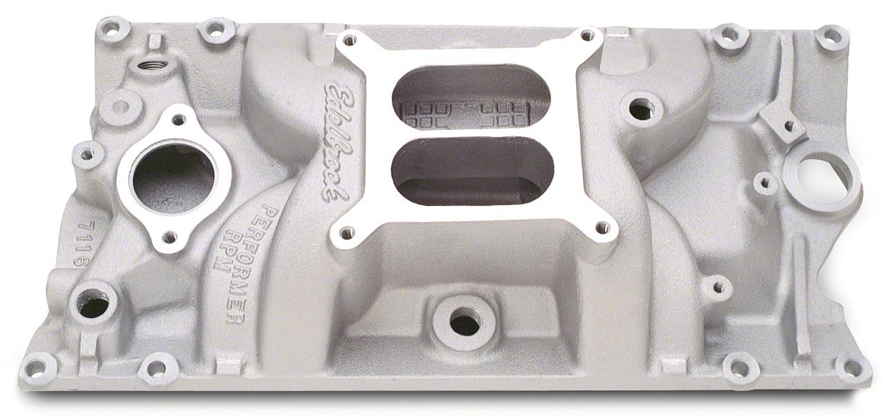 PERFORMER RPM VORTEC (1500-6500 RPM) Based on the powerful Edelbrock #7101, this single four-barrel intake is designed for the street rod, marine and engine swap market utilizing 262-400 c.i.d. Chevy V8's with 1996 and later Vortec (L31) cast iron or Edelbrock E-Tec aluminum heads. #2516 Marine intake features brass lined front water crossover and brass flange inserts to cover the rear water openings. An external water bypass boss is machined into the front of the water crossover for use on 1996 and later Vortec production engines. Manifold accepts square-bore carbs only. For street and marine engines operating from 1500-6500 RPM, see the Performer Vortec manifold or Performer Vortec EPS. Will not fit under stock Corvette hood. Available with satin, black or EnduraShine finish.