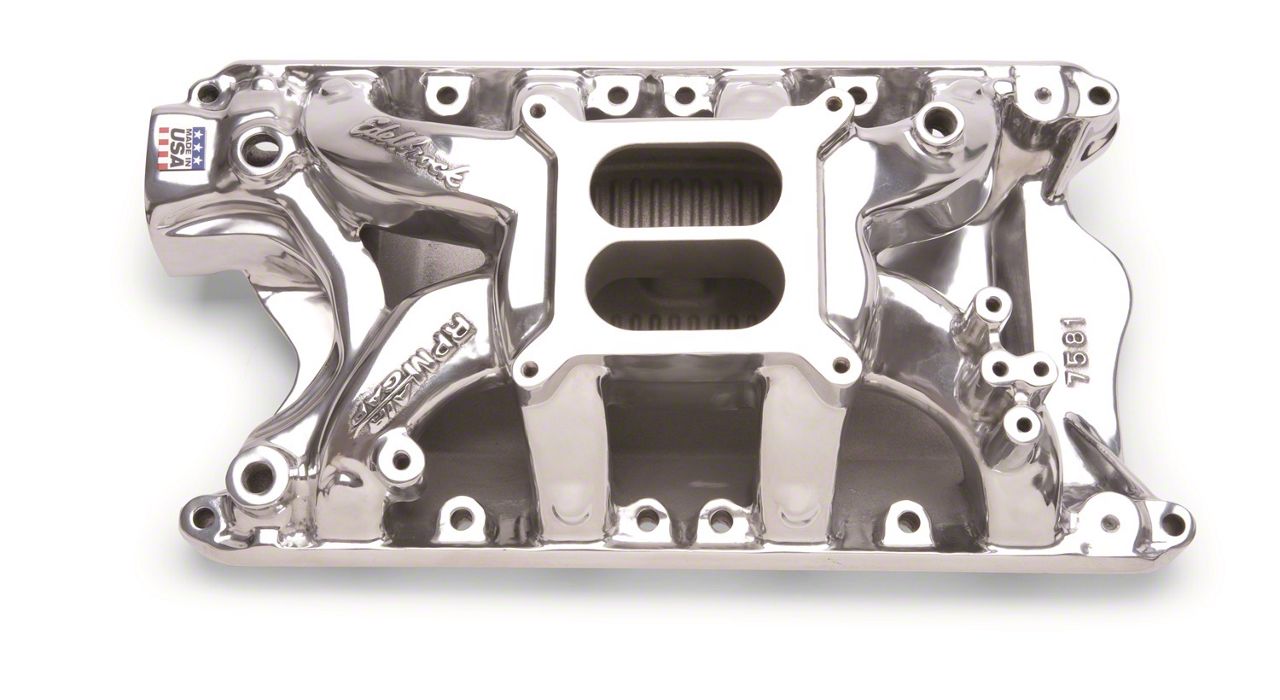Based on performer RPM-series with unique air gap. Air gap cooler and denser mixture for more power. Designed for 1500 to 6500 RPM. Improve performance on the street or race track.Larger cross-sectional area and taller card flange. Compatibility with large displacement 351W based engines. For 4 bbl carbs. Available in cast, polished and endurashine finish.