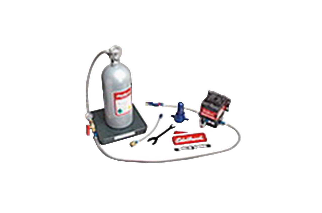 The refill pump station comes complete with all the plumbing, hoses, gauge, valve, fittings and bottle stand necessary to tranSfer nitrous from a mother cylinder to the receiving bottle. The pump runs off compressed air and requires no electrical hook-up