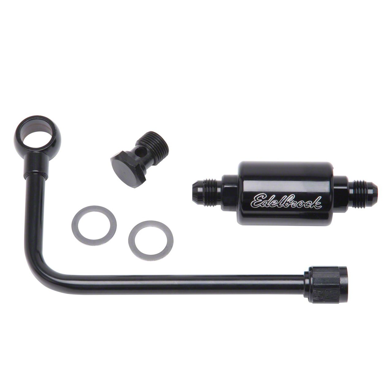 These fuel inlets for Edelbrock carburetors provide a clean and custom plumbing solution. The drop-down design routes the fuel line on the right-hand (passenger side) of the carburetor below the linkage and choke housing. The #8126 includes a barbed end for a push-on 3/8"" rubber fuel line. The #8131 and #8134 include an aluminum fuel filter with a 40 micron filter element and the -6AN male inlet will accept an Edelbrock fuel line kit for a complete fuel pump to carburetor plumbing solution. They are manufactured of chrome plated steel and include a 5/8" -20 threaded banjo bolt with gaskets.