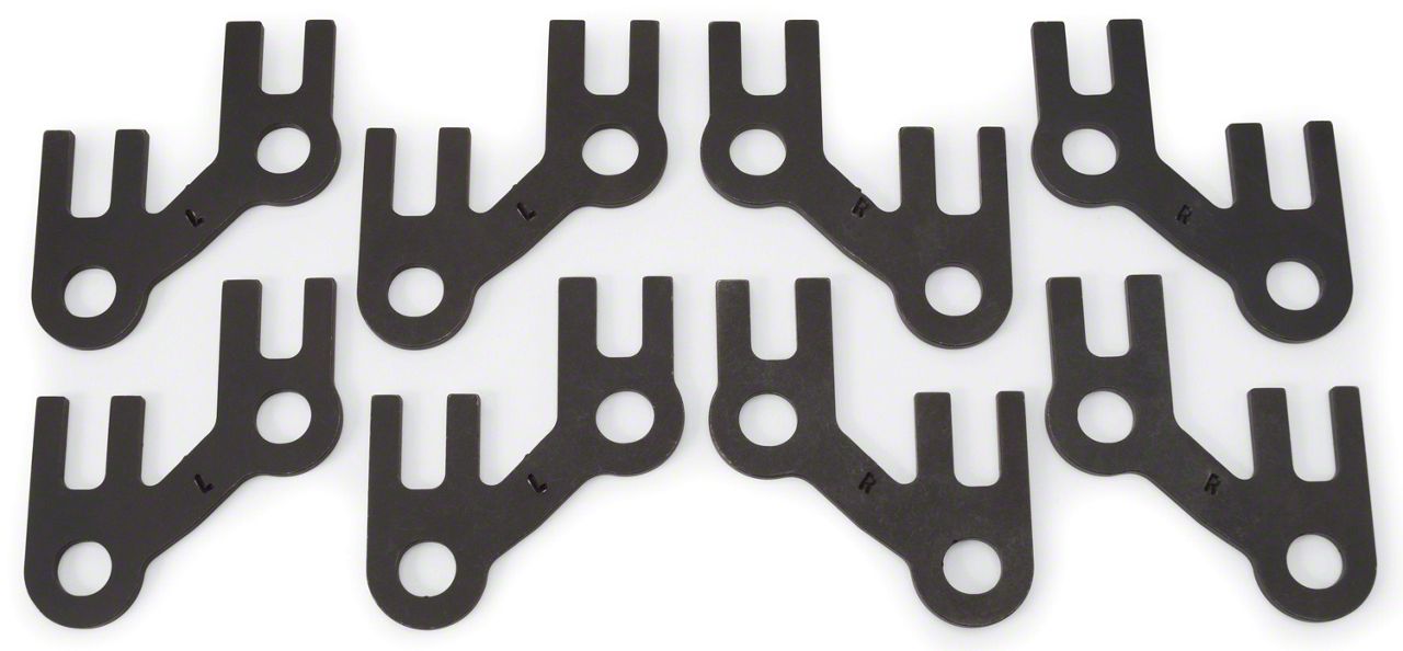 Pushrod guideplates. Made from high-grade alloy steel and hardened to 60 Rockwell "C". stepped plates support pushrod closer to rocker, stabilizing pushrods. Set of 8.