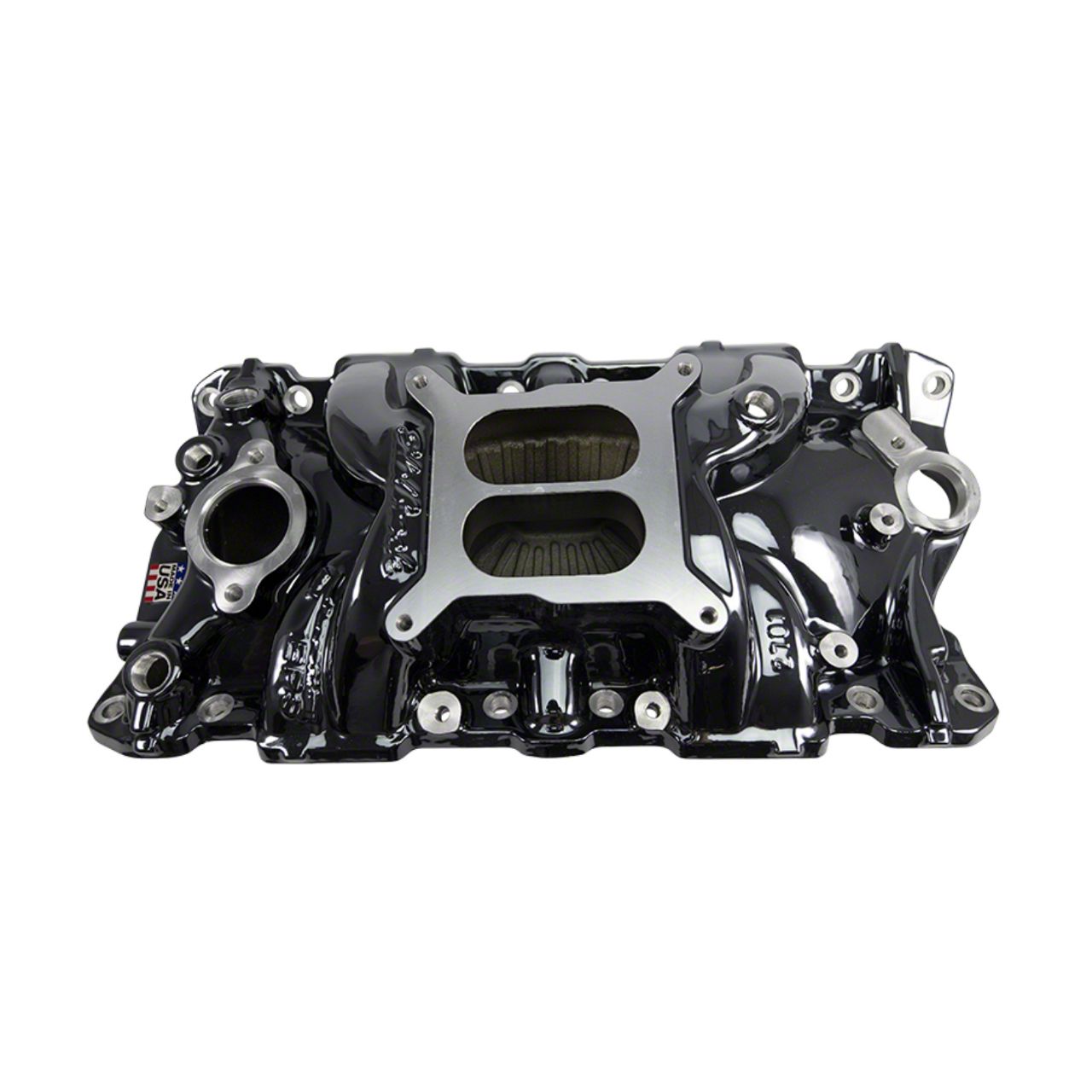 Edelbrock part #2701-BP Performer EPS intake manifold is for 86 and earlier 262-400 cubic-inch Chevys. Design is optimized for Edelbrock EPS or AVS2 carburetors, although any 4150 style carburetor will fit. Edelbrock's Patented dual-plane, low-rise design with a 180-degree firing order greatly improves torque over a wide rpm range and gives excellent throttle response. The Edelbrock Performer EPS intake manifold has a runner design that's tuned for peak torque at 3500 rpm on a 350-inch engine making it ideal for power from off-idle to 5500 rpm. Dyno tests showed gains of 5 hp and 9 ft-lbs. of torque over the Edelbrock Performer manifold #2101 on a 350 Chevy. This PN 2701-BP version comes with a beautiful reflective Black Plasma finish that is durable and easy to maintain. The Plasma finishes are applied by a fully automated 7 stage prewash and 4 stage finish. A durable clear powder coat finishes the process.** Will not fit under stock Corvette hood! **