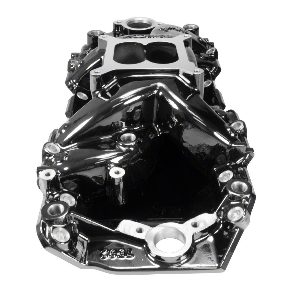 Edelbrock PN 7561-BP Air-Gap RPM Oval Port intake manifold is designed for high performance 396-502 c.i.d. Chevy V8's with large oval-port cylinder heads (1975 and earlier) or Edelbrock Performer/Performer RPM heads. This RPM Air-Gap incorporates the same race-winning technology that's been used on our Victor Series competition intakes for decades. The Air-Gap design features an open air space that separates the runners from the hot engine oil resulting in a cooler, denser charge for more power. Includes rear water outlets, two distributor clamp locations and nitrous bosses. Accepts all late model alternator and A/C brackets for the street. For square bore carburetors only. Will not fit under stock hood of Corvette, 1964-67 Chevelle or 1967-81 Camaro. Use with electric or manual choke carburetors sized for 750-850 cfm. This PN 7561-BP version comes with a beautiful reflective Black Plasma finish that is durable and easy to maintain. The Plasma finishes are applied by a fully automated 7 stage prewash and 4 stage finish. A durable clear powder coat finishes the process.