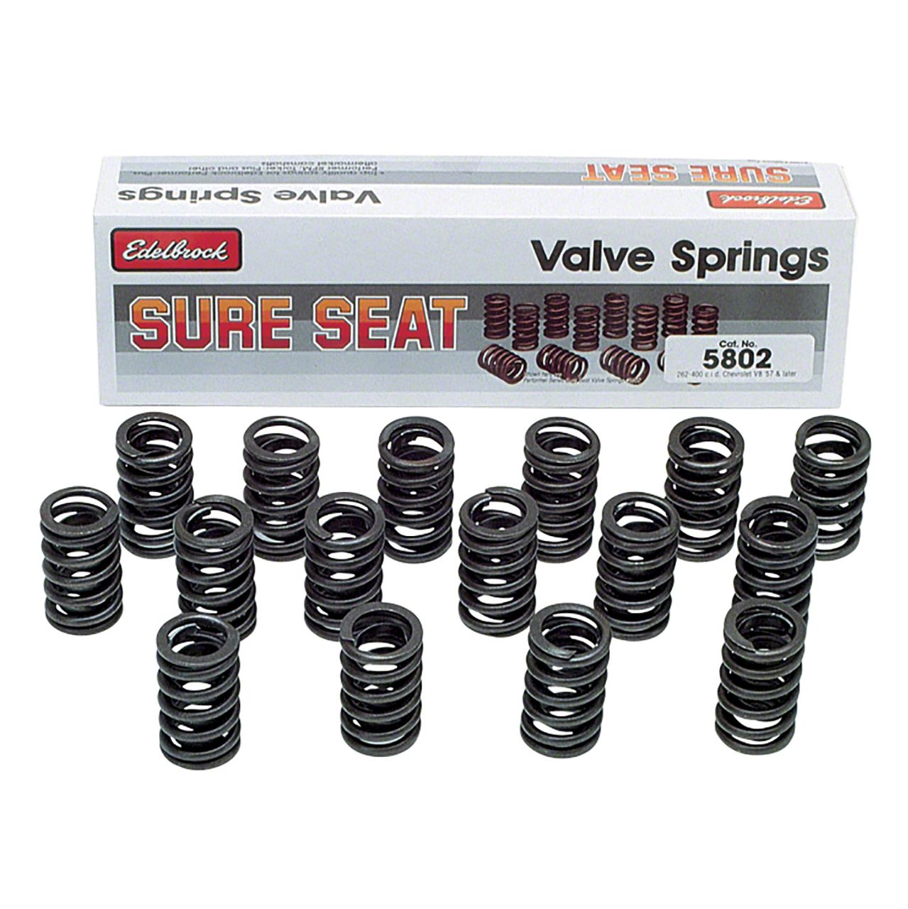 The Edelbrock #5802 Sure Seat Valve Spring for Chevy 262-400 V8 1957-95 O.E Cast iron cylinder heads are made of highest quality spring wire and precision wound to close tolerances, our Sure Seat Valve Spring sets are for use on original equipment heads when installing Edelbrock Performer-Plus, Performer RPM and Torker-Plus camshafts. These are the same high-performance springs used on Edelbrock Performer and RPM cylinder heads. For camshaft warranty compliance, use only the springs recommended by Edelbrock for each camshaft application.