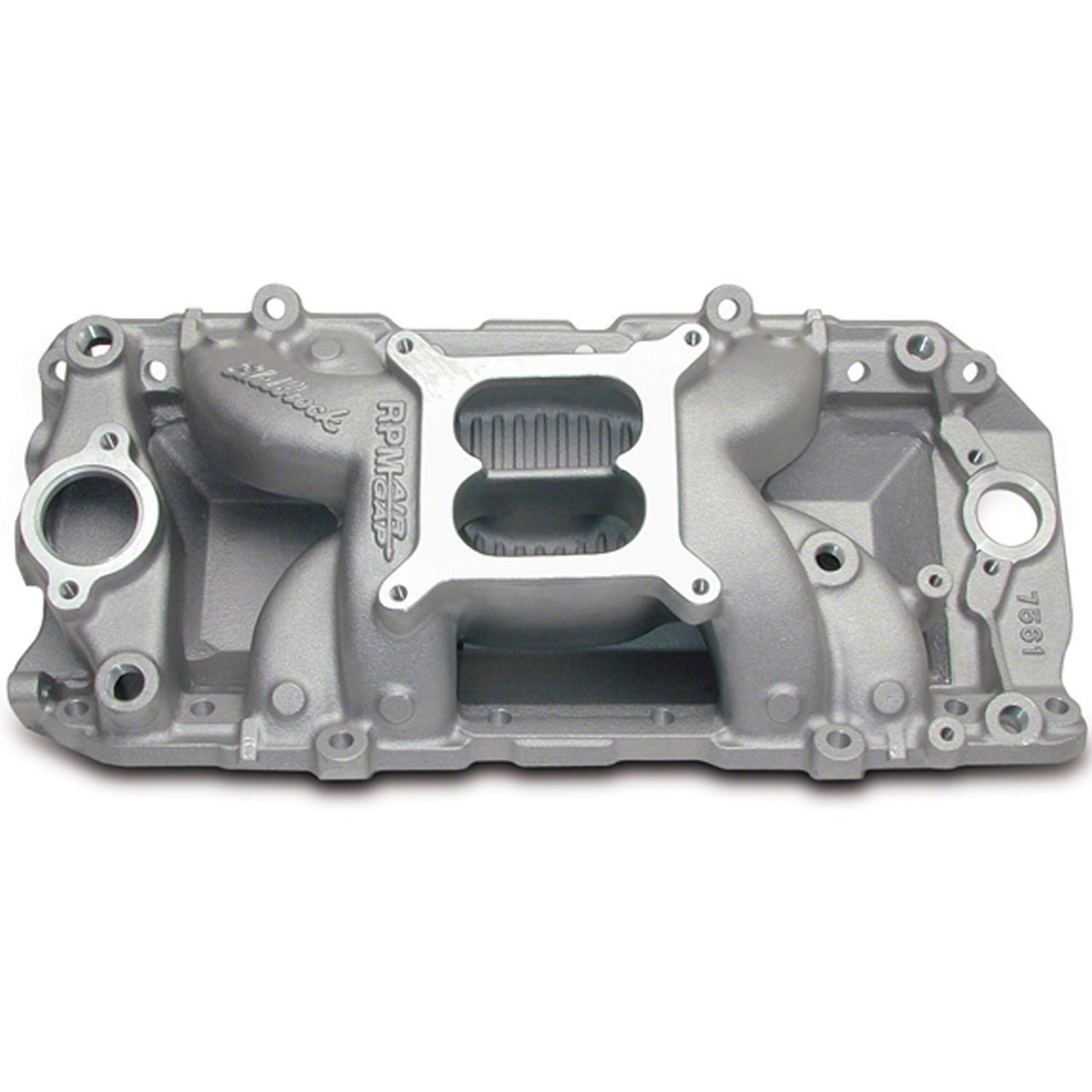 Edelbrock Part # 7561 RPM Air-Gap 2-O intake manifold is designed for street 396-502 c.i.d. Chevy V8's with large oval-port cylinder heads (1975 and earlier) or Edelbrock Performer/Performer RPM heads. This RPM Air-Gap incorporates the same race-winning technology that’s been used on our Victor Series competition intakes for decades. The Air-Gap design features an open air space that separates the runners from the hot engine oil resulting in a cooler, denser charge for more power. Includes rear water outlets, two distributor clamp locations and nitrous bosses. Accepts all late model alternator and A/C brackets for the street. For square bore carburetors only. Will not fit under stock hood of Corvette, 1964-67 Chevelle or 1967-81 Camaro. No provision for exhaust heated chok