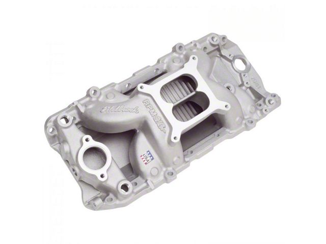Edelbrock Part # 7561 RPM Air-Gap 2-O intake manifold is designed for street 396-502 c.i.d. Chevy V8's with large oval-port cylinder heads (1975 and earlier) or Edelbrock Performer/Performer RPM heads. This RPM Air-Gap incorporates the same race-winning technology that’s been used on our Victor Series competition intakes for decades. The Air-Gap design features an open air space that separates the runners from the hot engine oil resulting in a cooler, denser charge for more power. Includes rear water outlets, two distributor clamp locations and nitrous bosses. Accepts all late model alternator and A/C brackets for the street. For square bore carburetors only. Will not fit under stock hood of Corvette, 1964-67 Chevelle or 1967-81 Camaro. No provision for exhaust heated chok