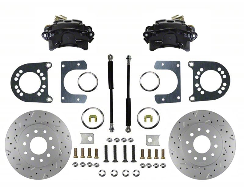 Add the safety, reliability and performance of rear disc brakes to your full size Chevrolet with Rear End Disc Brake Conversion Kit. In this kit you receive everything you need to mount black powder coated single piston disc brakes to your GM 10 Bolt Rear Axle. All components used in these kits are new high quality, precision machined products with a zinc plated finish to reduce corrosion and extend the life of your brake system. The heavy duty parking brake caliper will allow you to use your stock parking brake cables to actuate your parking brake.